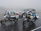 到了遊客中心之後, 有很多騎摩車的人和我們一樣被天氣困在這裡, 等了15分鐘之後, 天氣一點都沒有變好的跡象. 和Eric討論一下, 我們決定下山. 因為要是等一下開始積雪, 我們就絕對下不了山了. 由於能見度很差, 所以我們是以龜速下山, 還好開車的人都對我們很有耐心, 只要到可以超車的地方我們就讓他們先過. 一路上有可加熱外套, 所以還不算冷. 不過雪不停的積在安全帽的面罩上, 要不時地擦, 所以我們大概每騎一分鐘就得停下來擦面罩. 本來只要30分鐘的路程, 因為天氣的關係變成1.5個小時. 不過後來總算是平安下山.